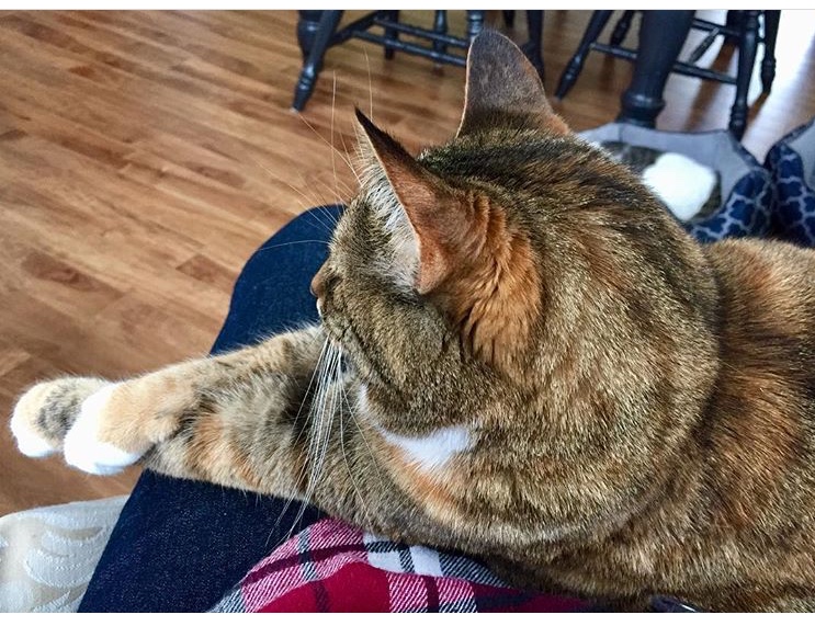 On the other hand, I have no pics of Maisie hanging out with books. Perhaps she’s illiterate? Anyway, it’s all good. She often cuddles up close when I’m reading.