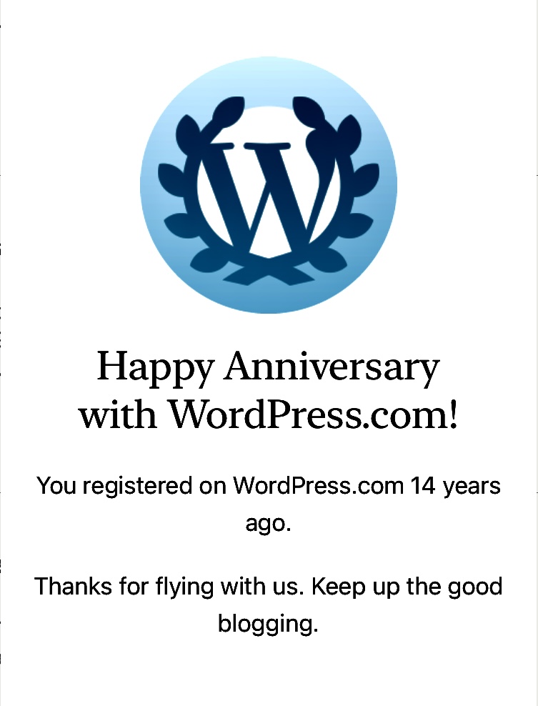 WordPress informs me that I have an anniversary. As of yesterday, I have been blogging for fourteen years.