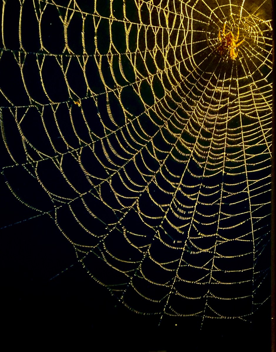 Cee Neuner’s challenge for photographers yesterday* reminds me of this photo I took back in August. I captured the spider and her masterpiece through my kitchen window that fog-shrouded night, not knowing how the outdoor light on our house would illuminate its detail so well, especially the misty moisture that clings to every intricate strand of the web. The overall effect reminds me of fine gold chain.