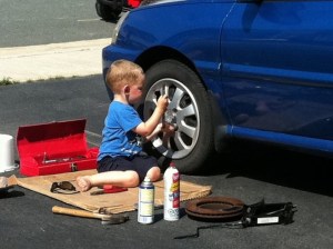 In many ways, my grandson J is your typical little boy. He likes to do the things his dad does, which includes everything from working on the car..