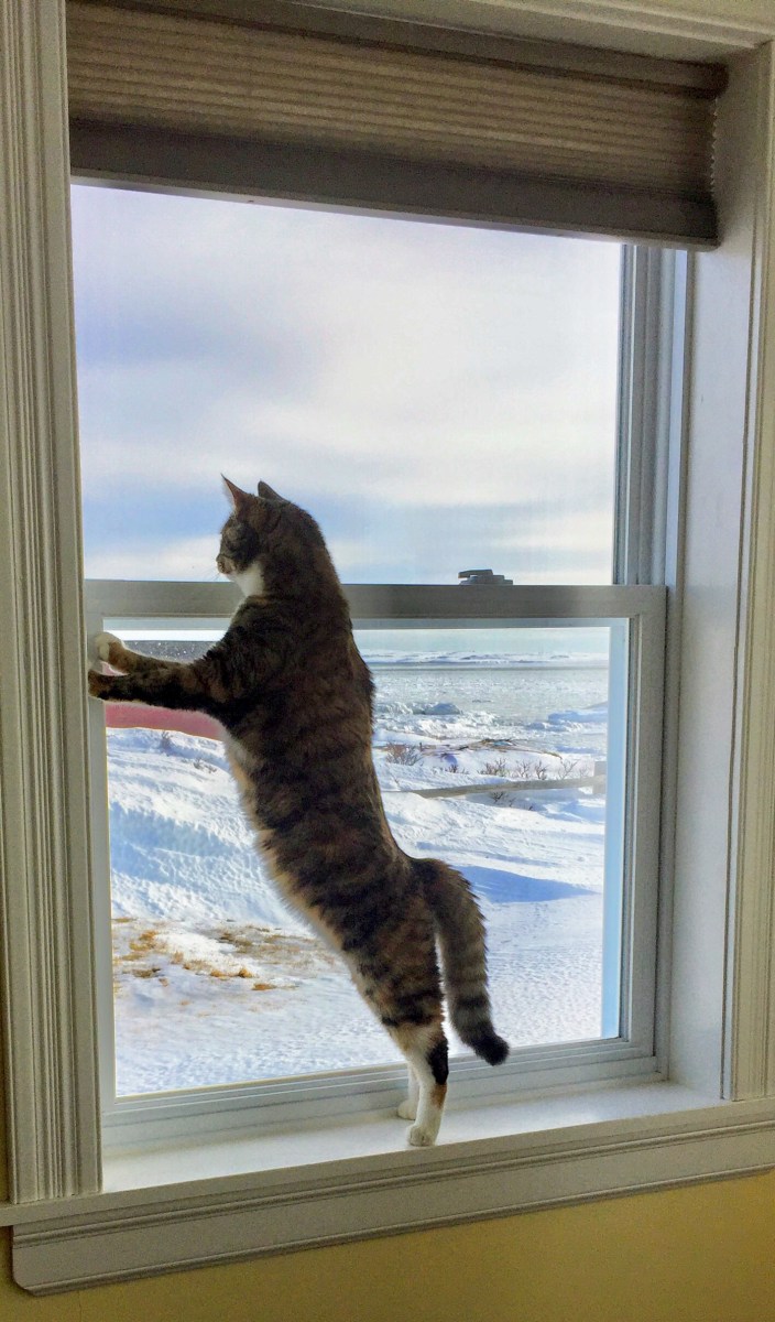 Our Maisie was the epitome of worry and concern the other day when she caught a flicker of movement outside the window. Standing on tippy-toes to see over a snowbank, she spied a neighbour’s cat prowling around our property.