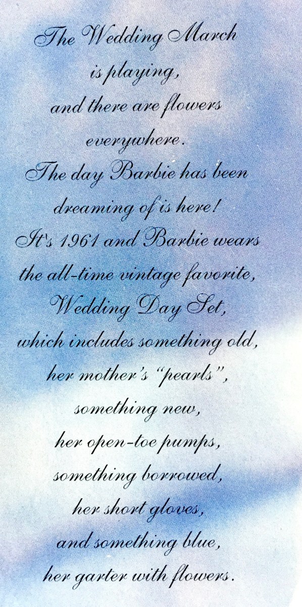 Twenty five years later, I’m dusting Barbie off and “unveiling” her for you. This is what is written on the back of the box: