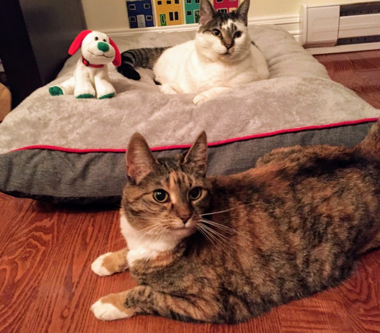 Maisie here, wishing my sister Vivian would make room for me on our big new bed in the living room. Yes, our early Christmas present is actually a dog bed, but it’s oh-so-comfy for us cats too.